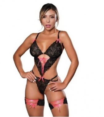 Conjunto en Encaje, Liguero y Cintas